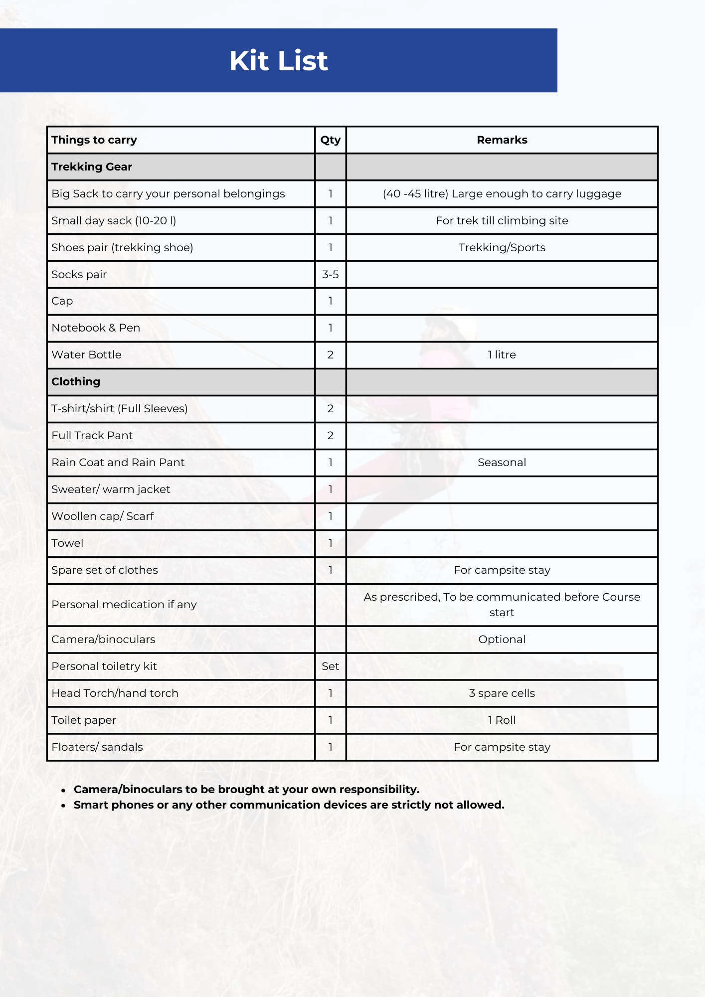 Kitlist – Please download the kitlist from here